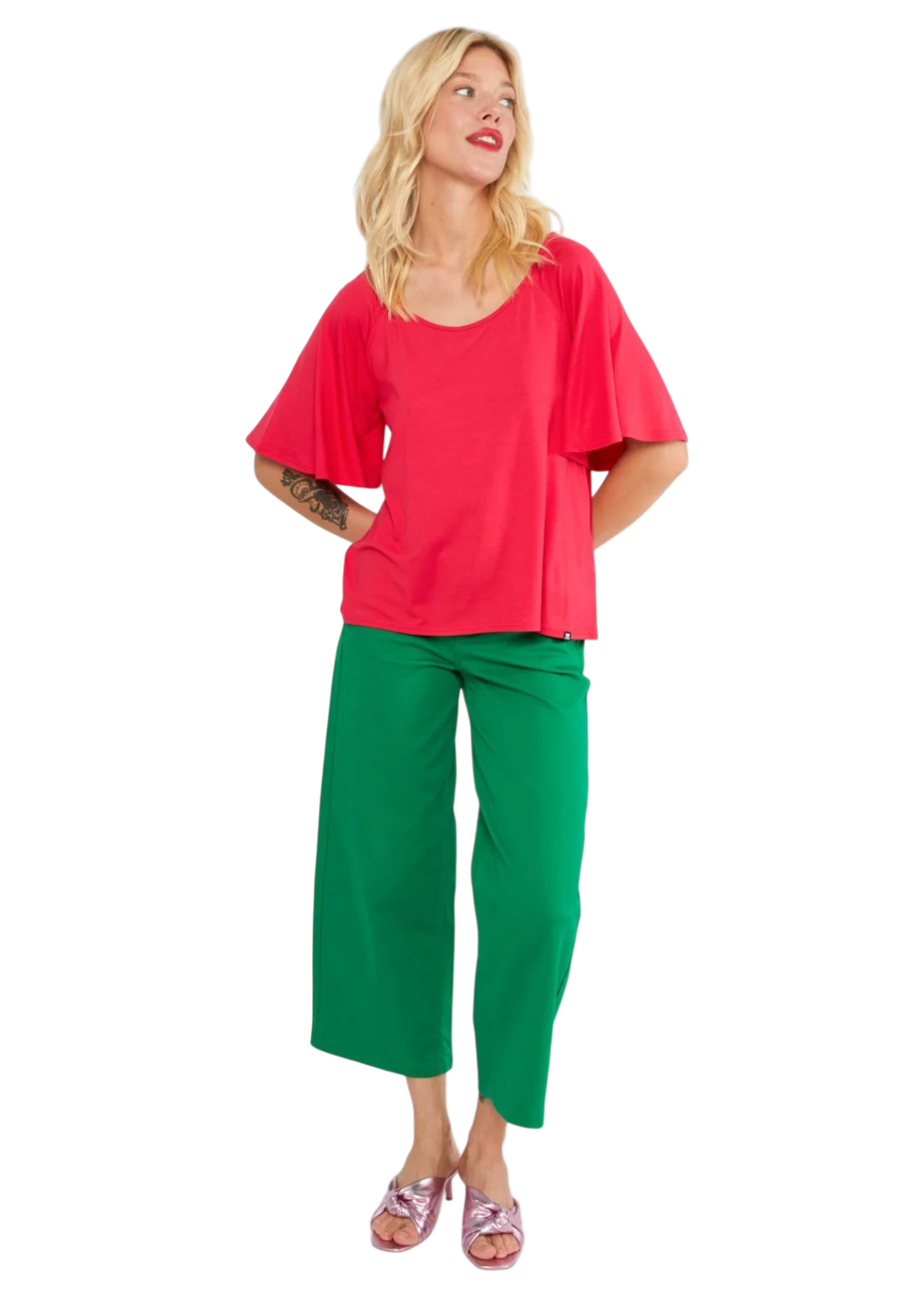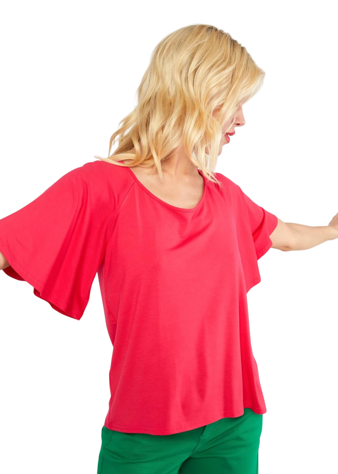 Het model heeft een ronde hals en een subtiel verfijnd decolleté aan de achterkant. De wijd uitgesneden vleermuismouwen geven de top een luchtige, speelse look en zorgen voor extra bewegingsvrijheid.