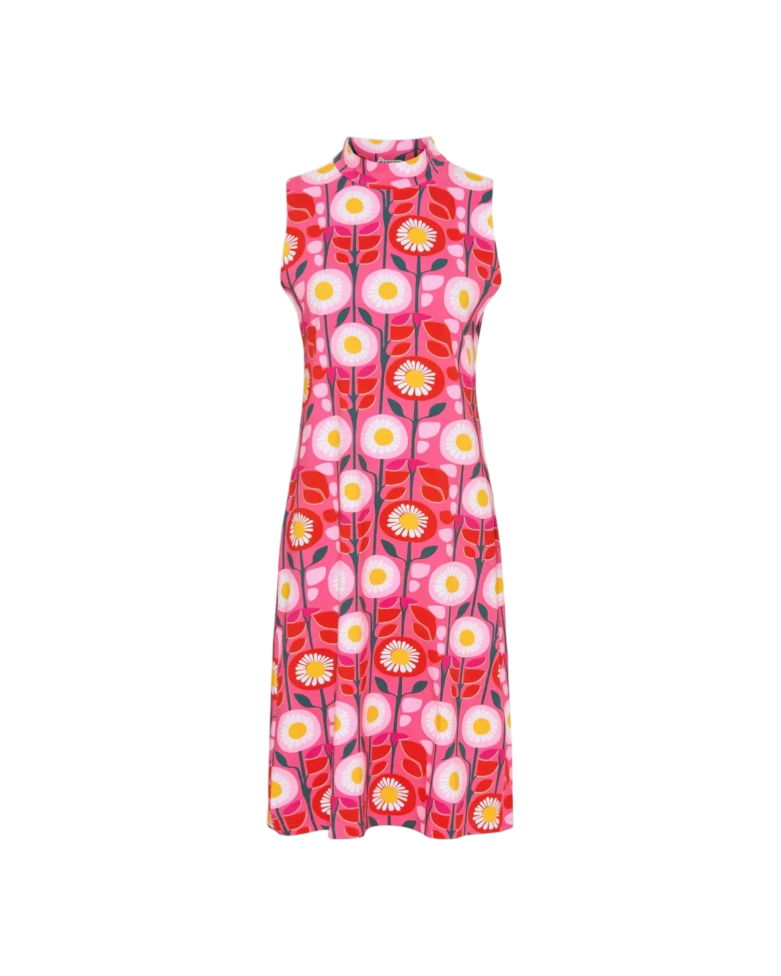 Het mouwloze ontwerp en het kleine opstaande colletje geven de jurk een verfijnde uitstraling, terwijl de comfortabele pasvorm ervoor zorgt dat je hem moeiteloos de hele dag draagt.