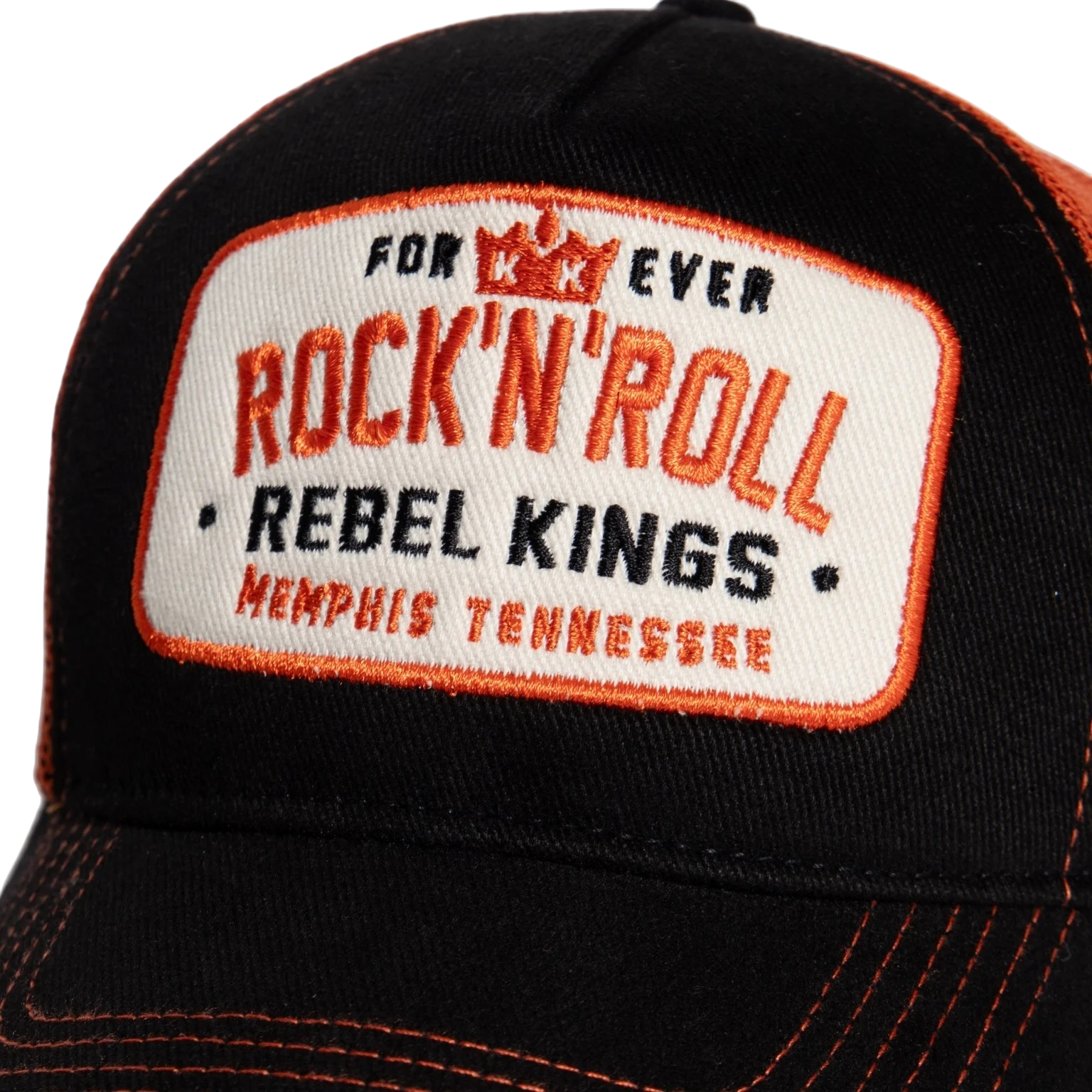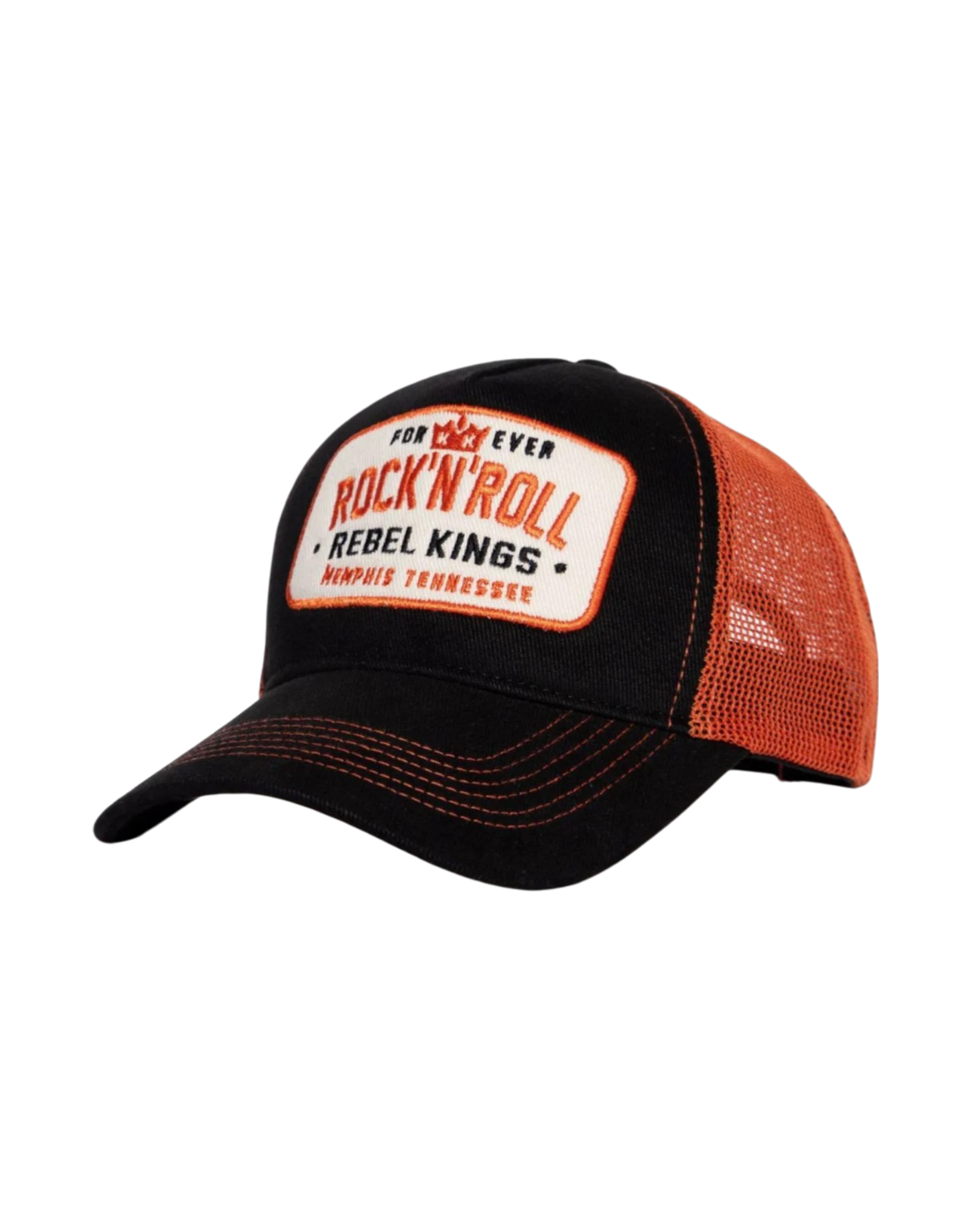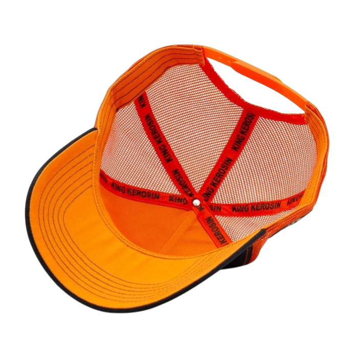 Voel de echte Rock’n’Roll vibe met de King Kerosin “Rebel Kings” cap. Deze trucker cap ademt de rebelse energie van Memphis, Tennessee – één van de bakermatten van Rock’n’Roll. De cap combineert klassiek zwart met een opvallend oranje mesh en bijpassende stiksels die meteen in het oog springen.