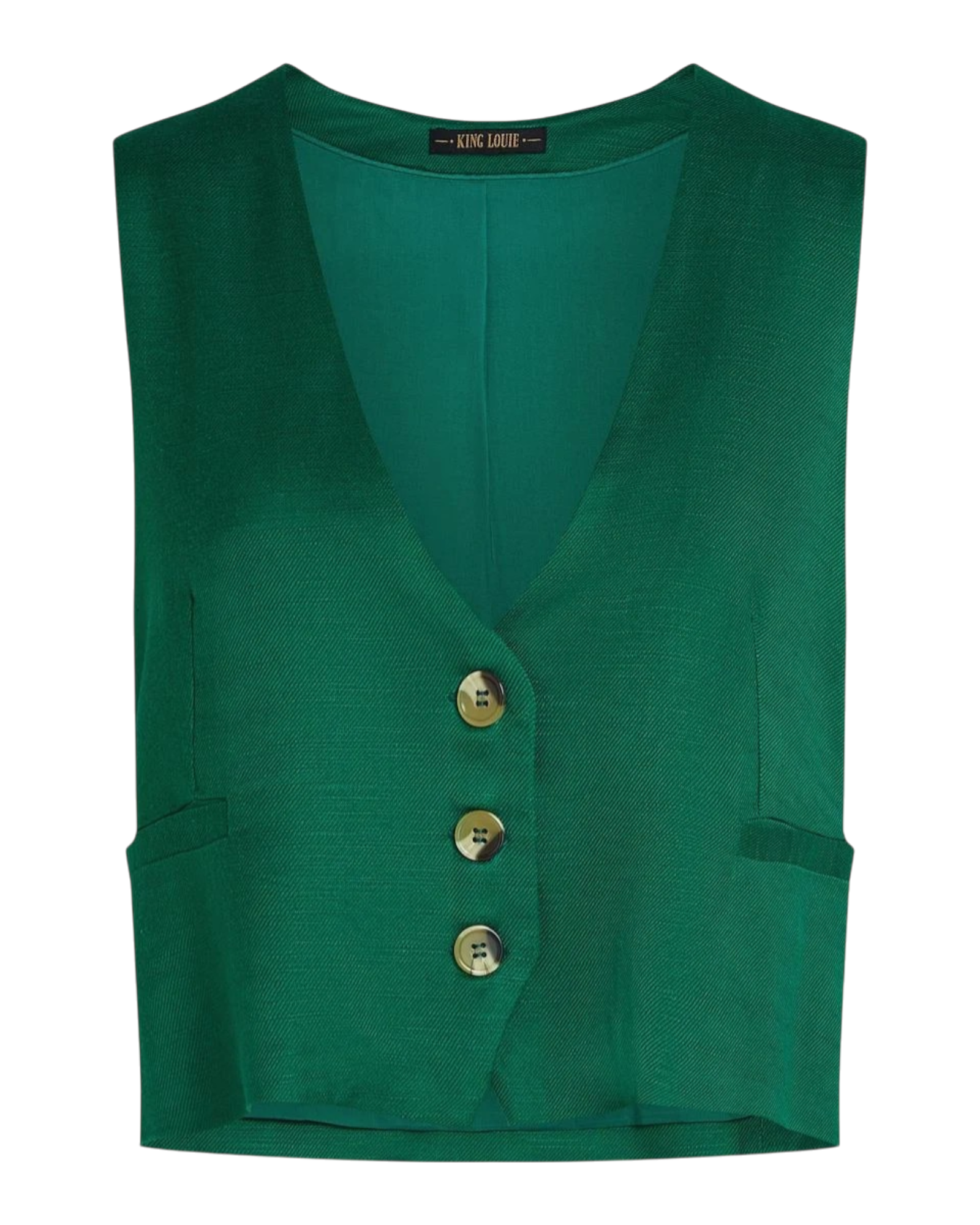 De Cissy Gilet Cameron van King Louie is een elegante mouwloze gilet in de kleur Nile Green. Het model heeft een getailleerde pasvorm en een knoopsluiting aan de voorkant, wat zorgt voor een stijlvolle en vrouwelijke uitstraling.