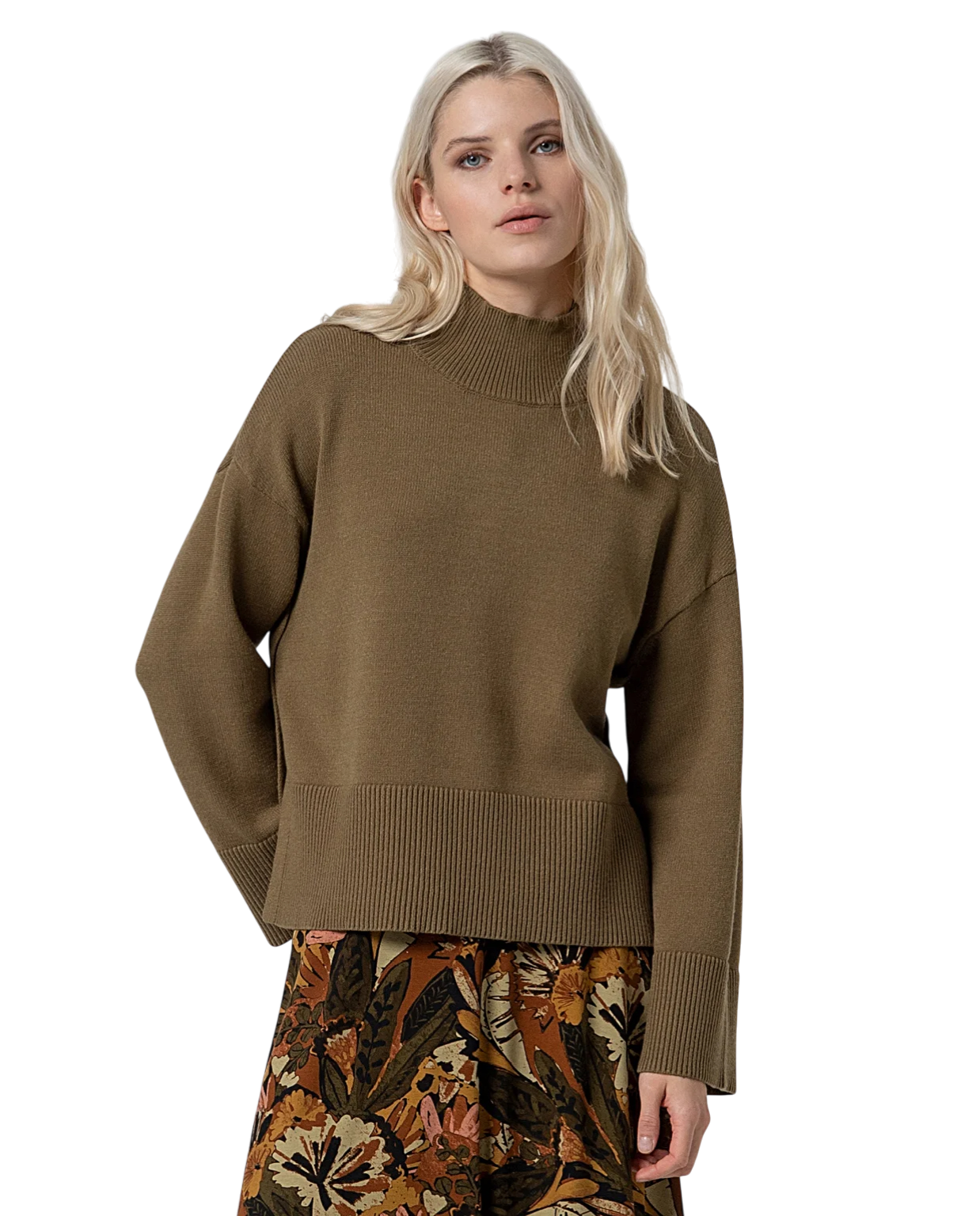 De Surkana sweater “Dolores” is een basic met karakter. Deze gebreide trui is superzacht en lekker elastisch, met een stijlvolle perkins kraag en lange, uitlopende mouwen. Perfect voor elke dag, met een relaxed maar flatterend silhouet.