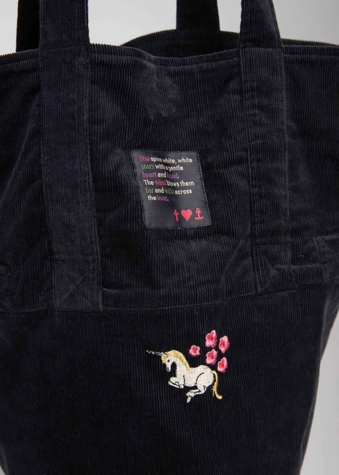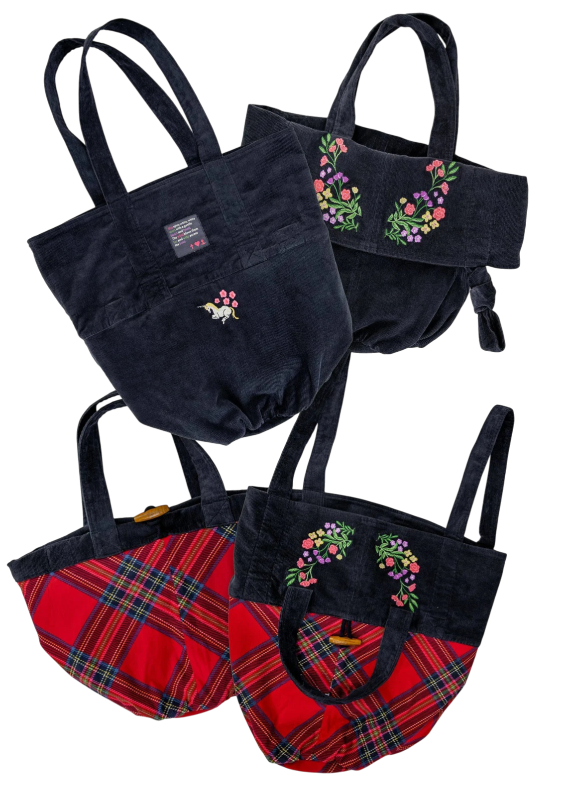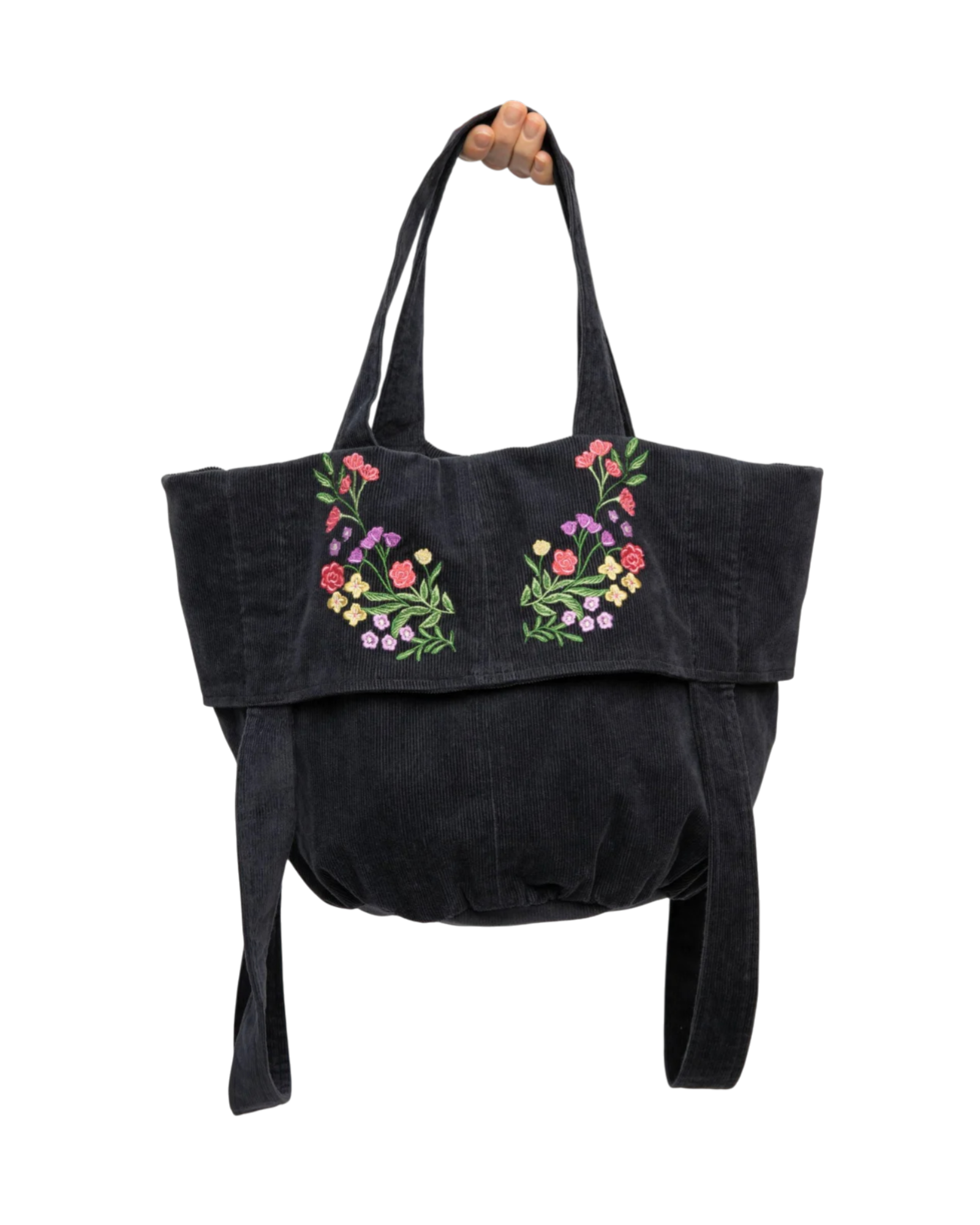 Dankzij de omkeerbare functie wissel je eenvoudig van look. De tas is uitgevoerd in babyrib en afgewerkt met een uitgebreid veelkleurig borduursel. De kenmerkende patch op de corduroyzijde geeft haar die typische Blutsgeschwister-signatuur.