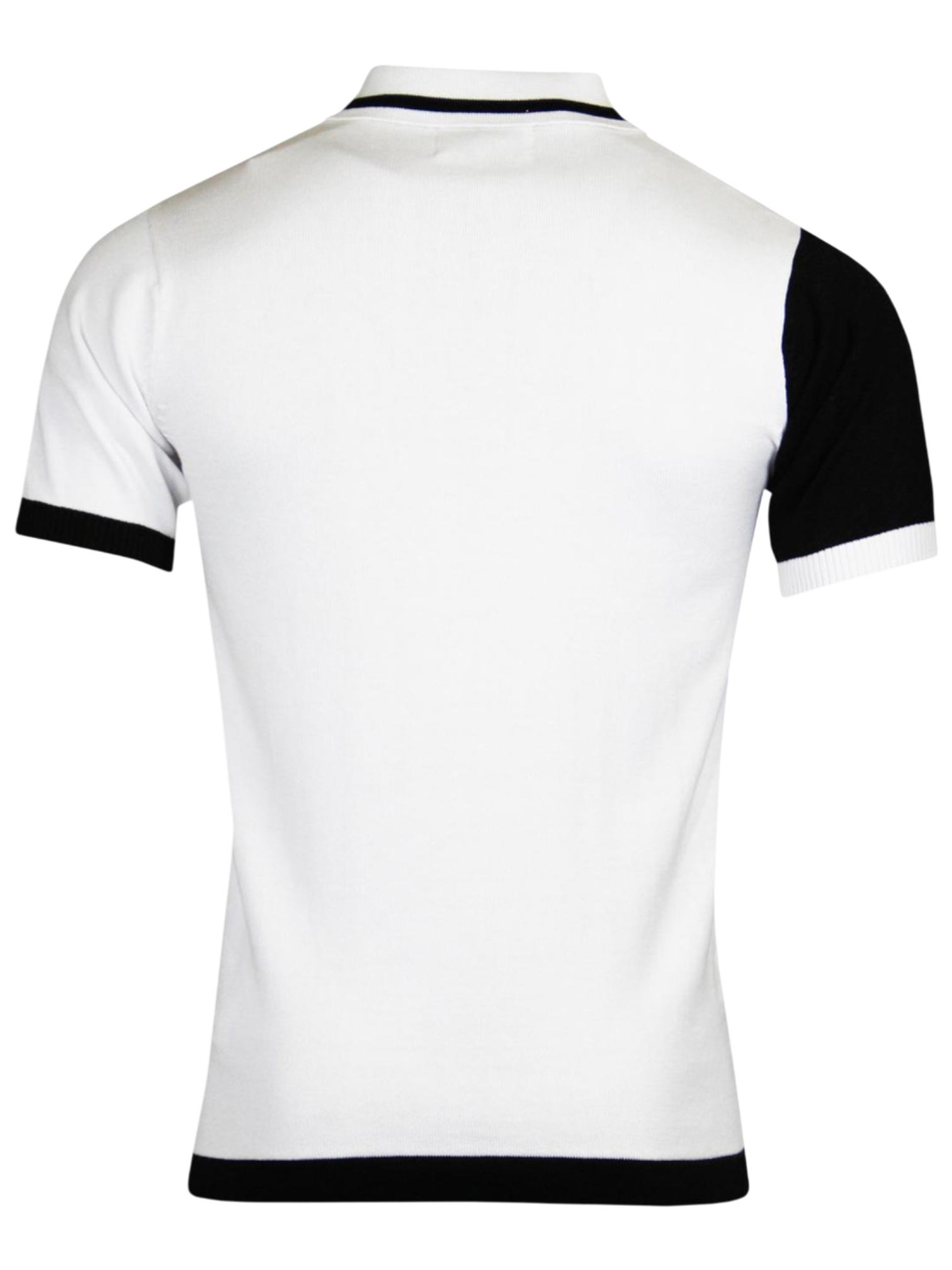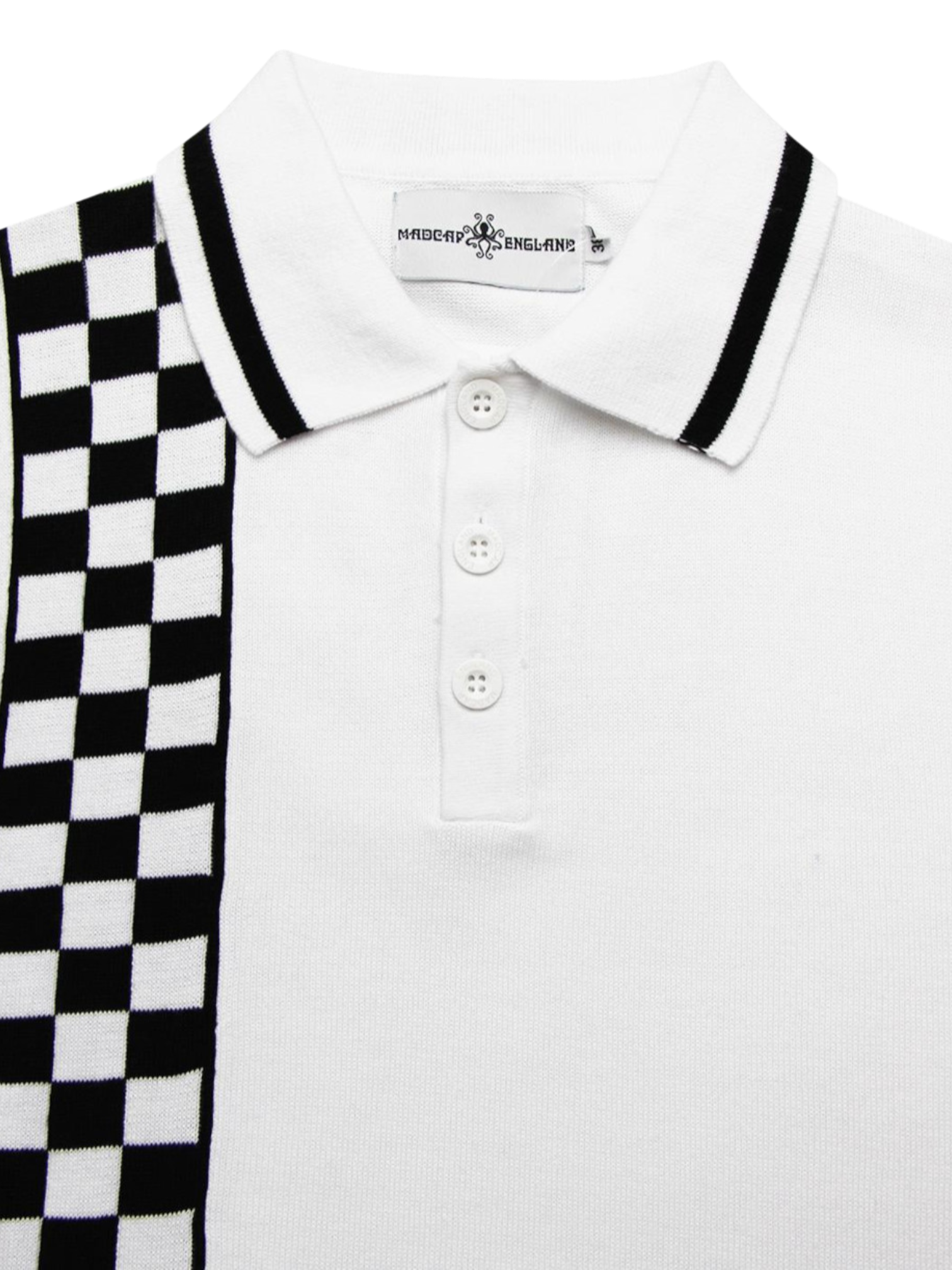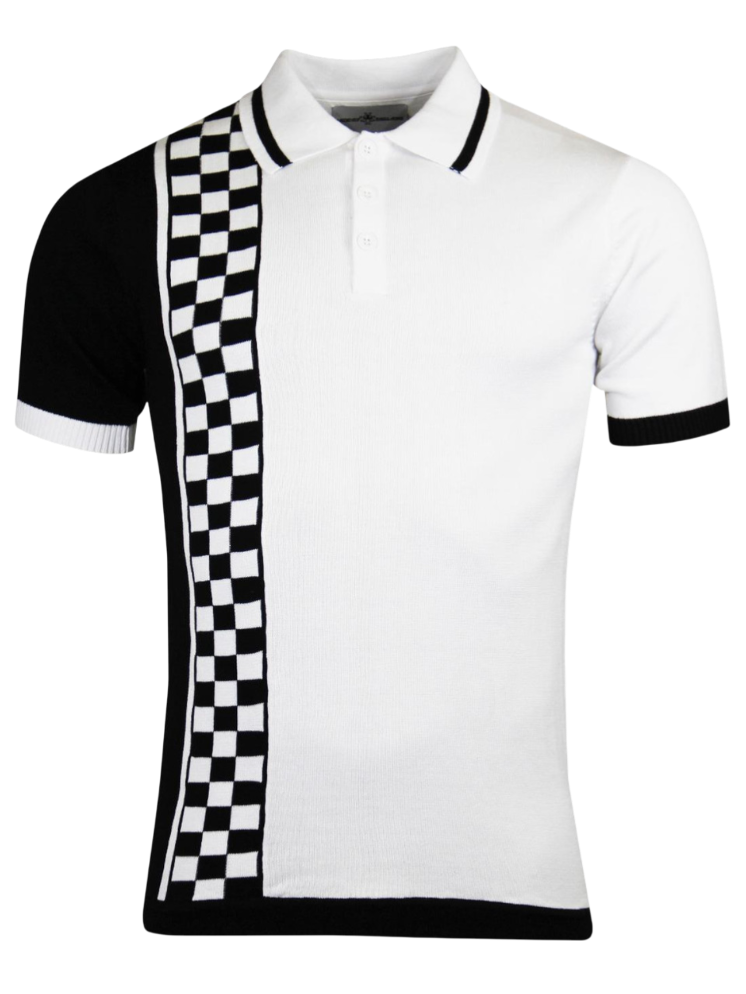 • Retro mod / ska knitted polo met checkerboard “racing stripe” aan één zijde