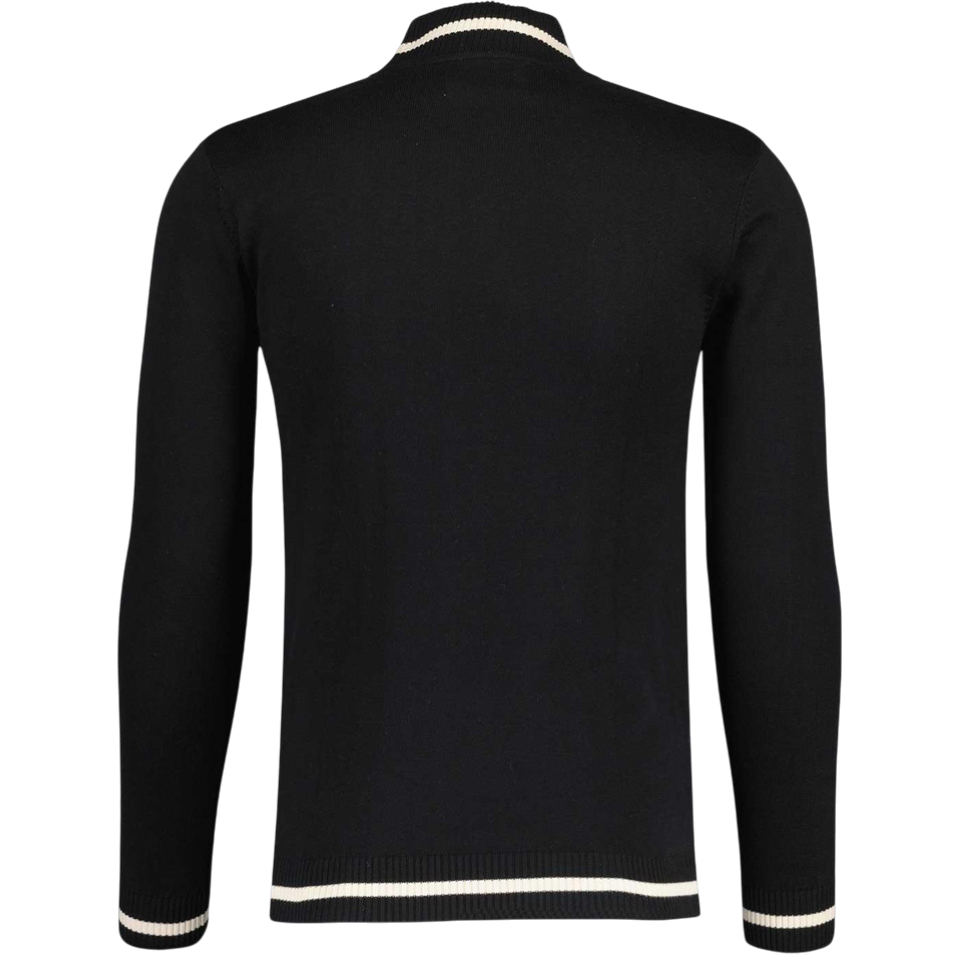 De Madcap England “Pirelli” is een 60s mod geïnspireerde mock turtleneck jumper in zwart. Met zijn wafelstructuur, contrasterende retro strepen en verfijnde details straalt deze knit pure mod-elegantie uit.