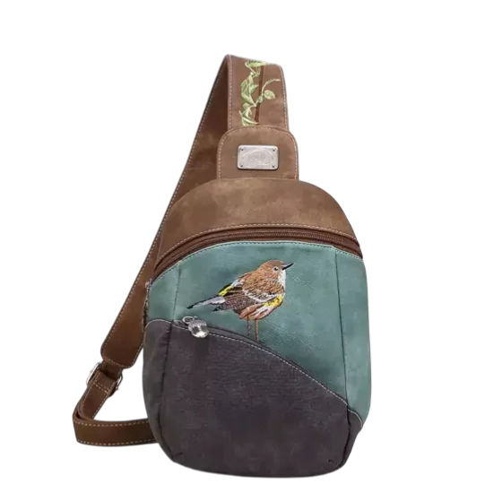 rugzak, slingbag "Tjirp", donkerbruin/ aqua/ donkergrijs