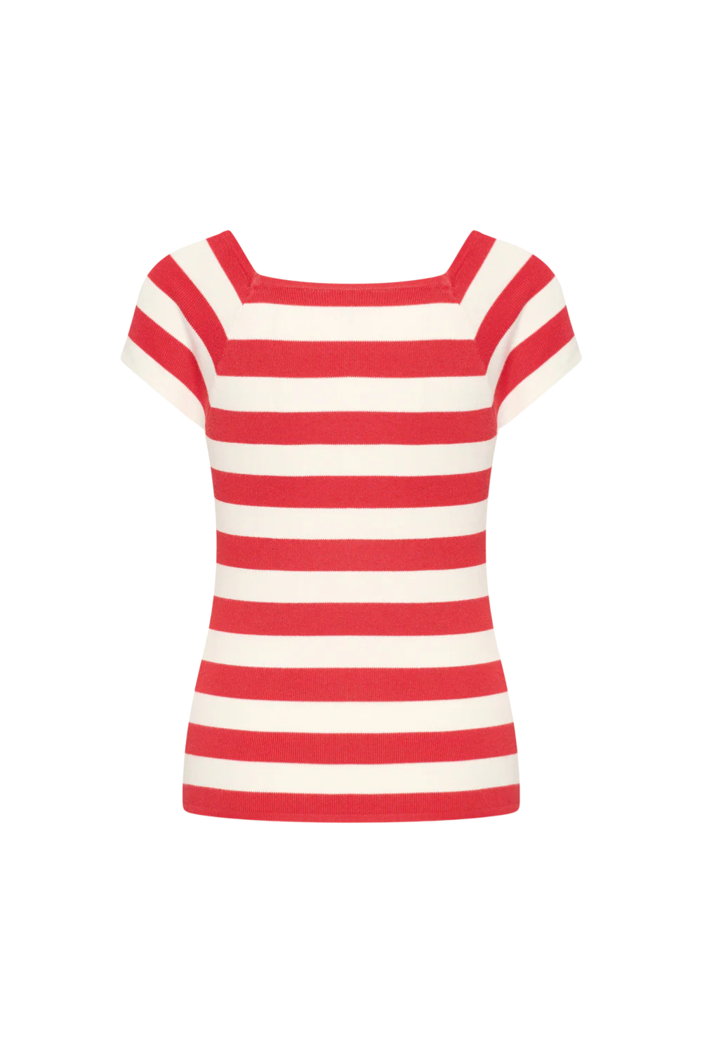 De top heeft een elegante vierkante hals, zowel aan de voor- als achterzijde, wat haar net even anders maakt dan een standaard basic. Het fijne breisel voelt zacht en comfortabel aan op de huid, terwijl de korte raglanmouwen zorgen voor een mooie schouderlijn.