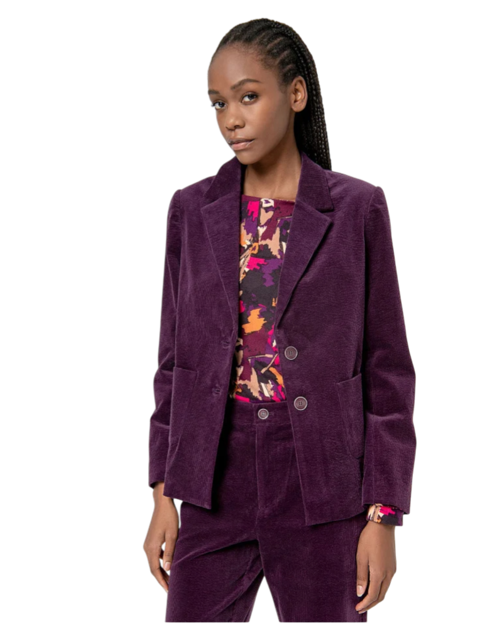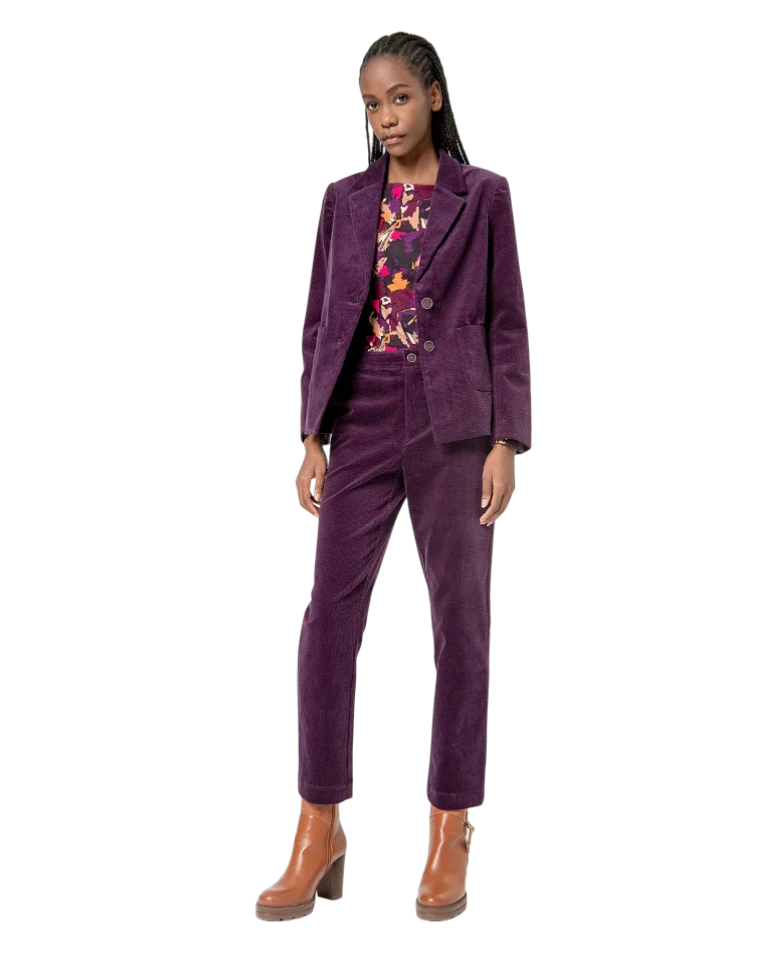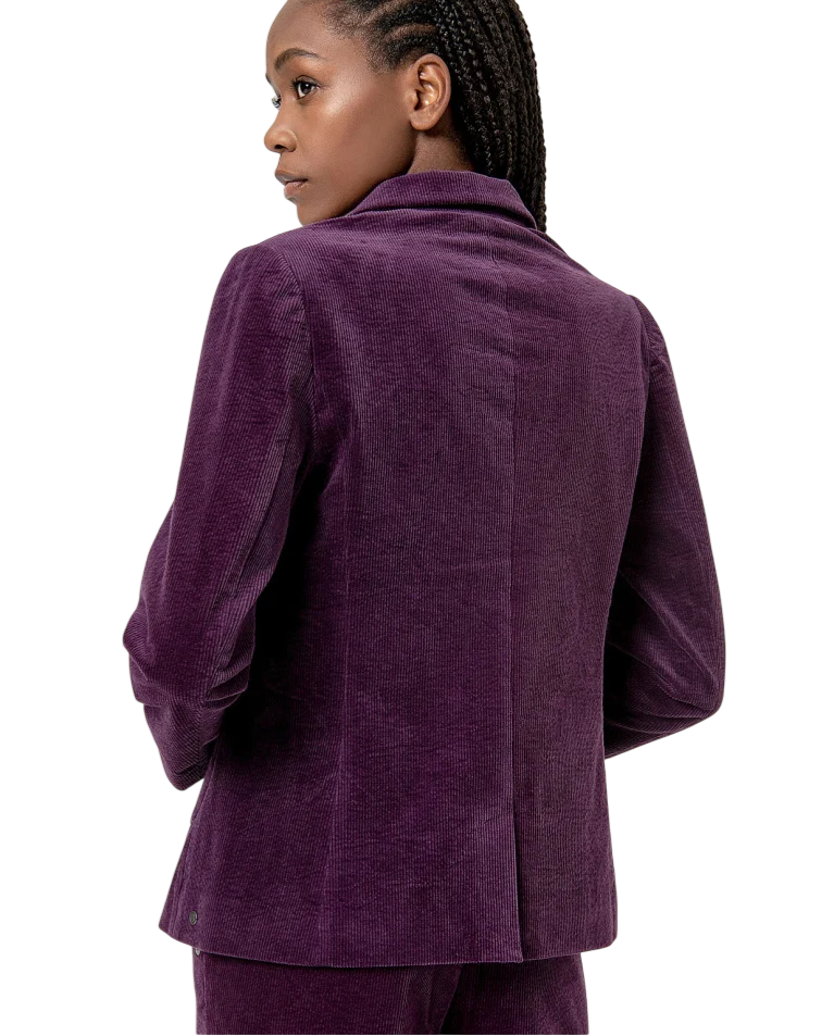De Surkana “Valeria” in paars is uitgevoerd in ribcord en straalt warmte en stijl uit. De rijke structuur van de stof geeft dit jasje een speelse retro-touch.