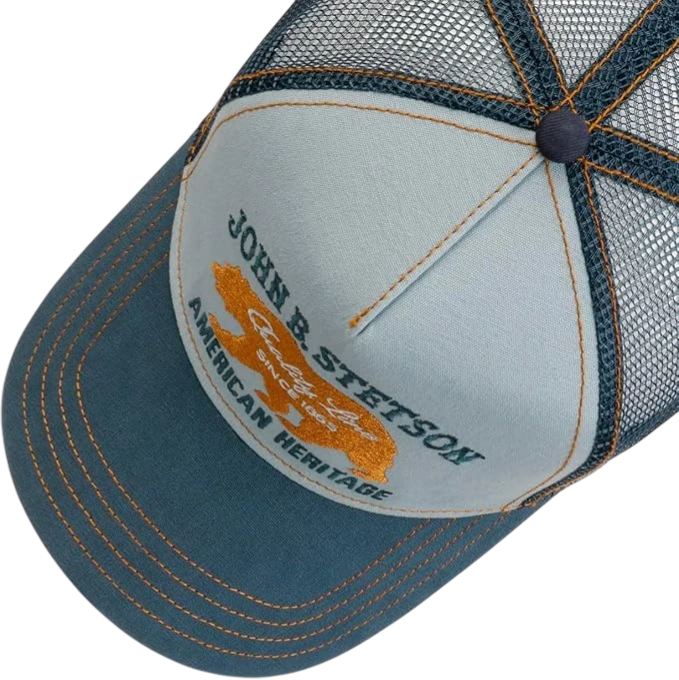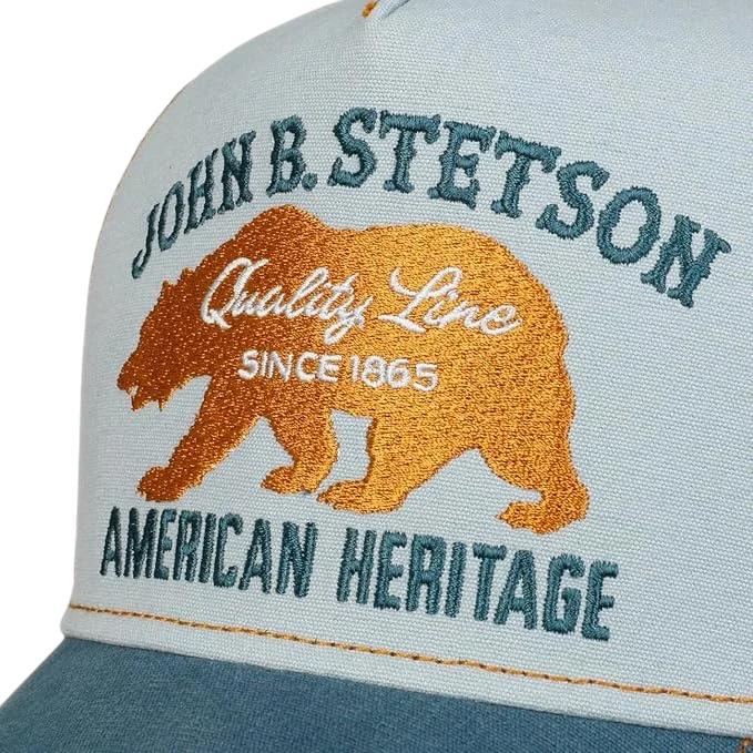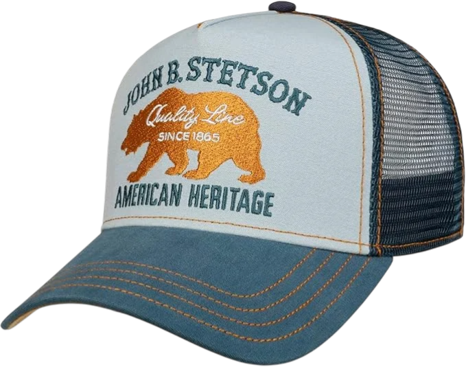 Fris, klassiek en nét even anders: deze Stetson trucker cap combineert een lichtblauwe front met een blauwe klep en mesh-achterzijde. De geborduurde beer-patch met “American Heritage” geeft ’m die typische Stetson vibe.