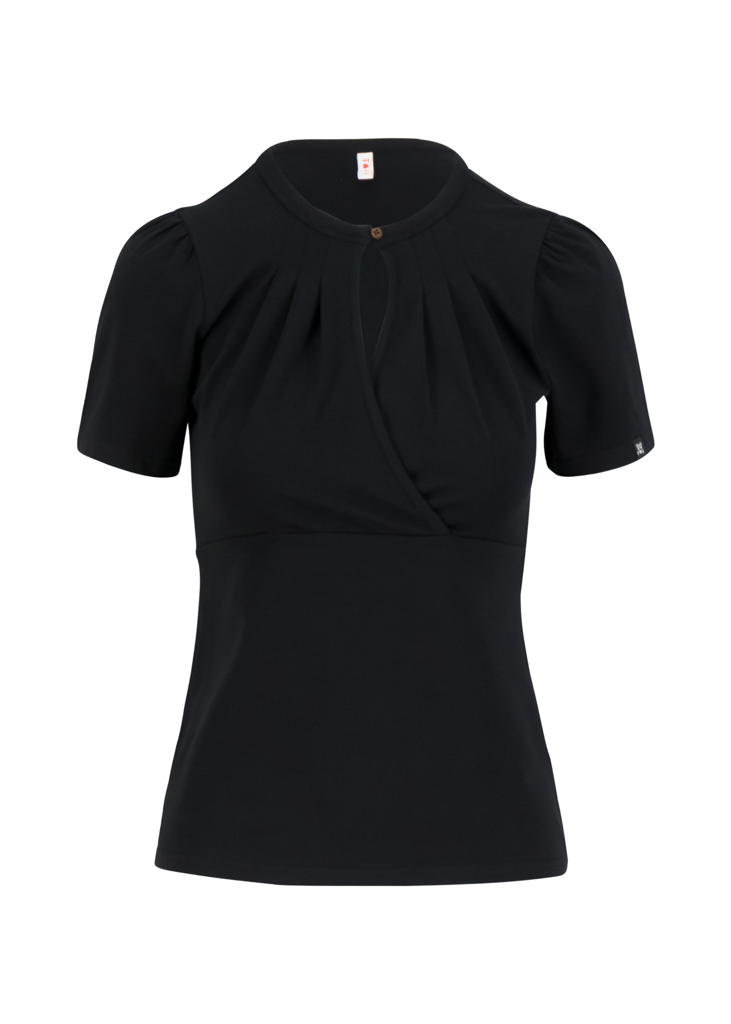 Aansluitend T-shirt met een speelse hartjesprint en een vrouwelijke criss-cross halslijn. De zachte biologische katoenjersey met stretch voelt comfortabel aan en volgt mooi de lichaamsvorm.