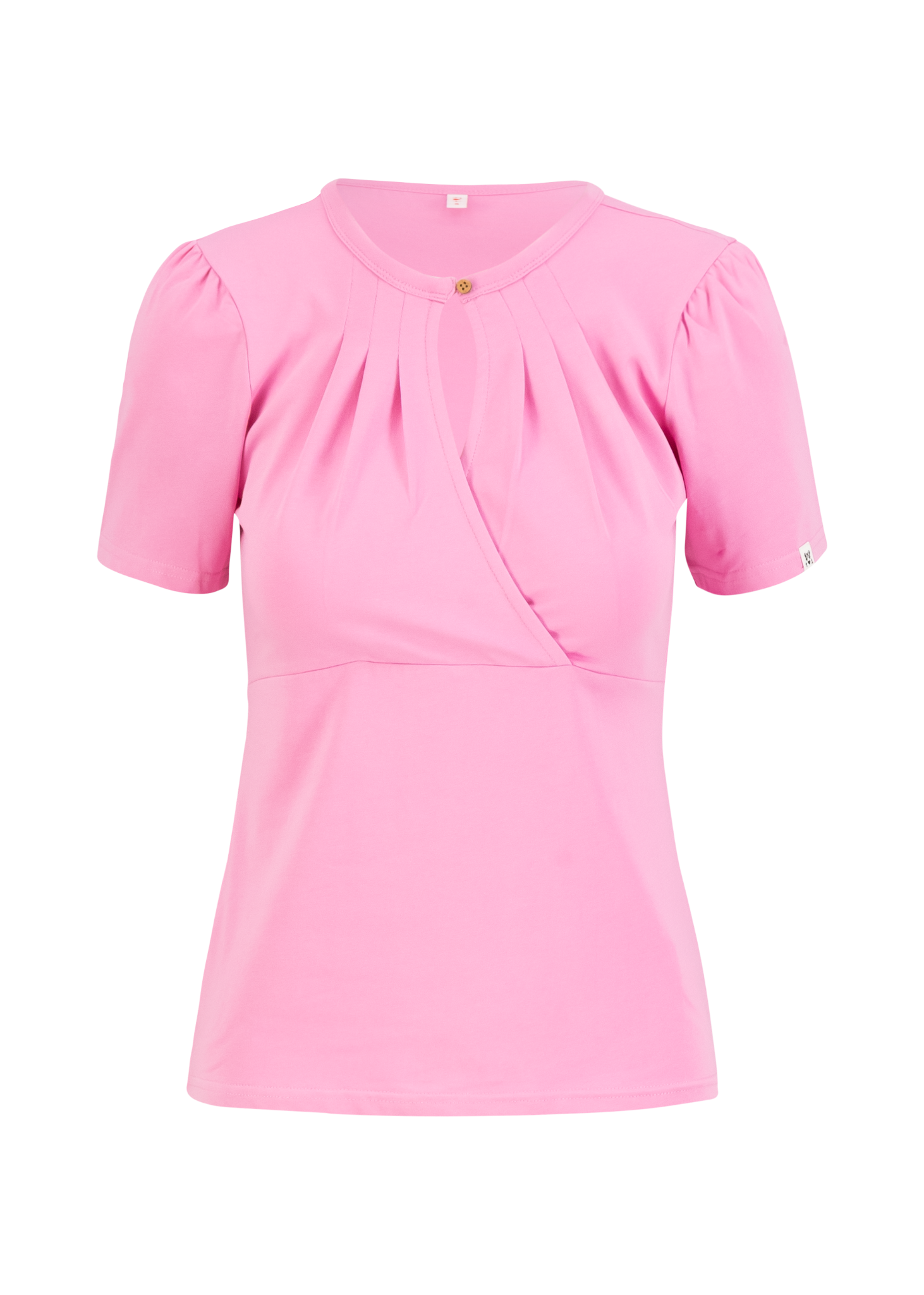 Aansluitend T-shirt met een speelse hartjesprint en een vrouwelijke criss-cross halslijn. De zachte biologische katoenjersey met stretch voelt comfortabel aan en volgt mooi de lichaamsvorm.