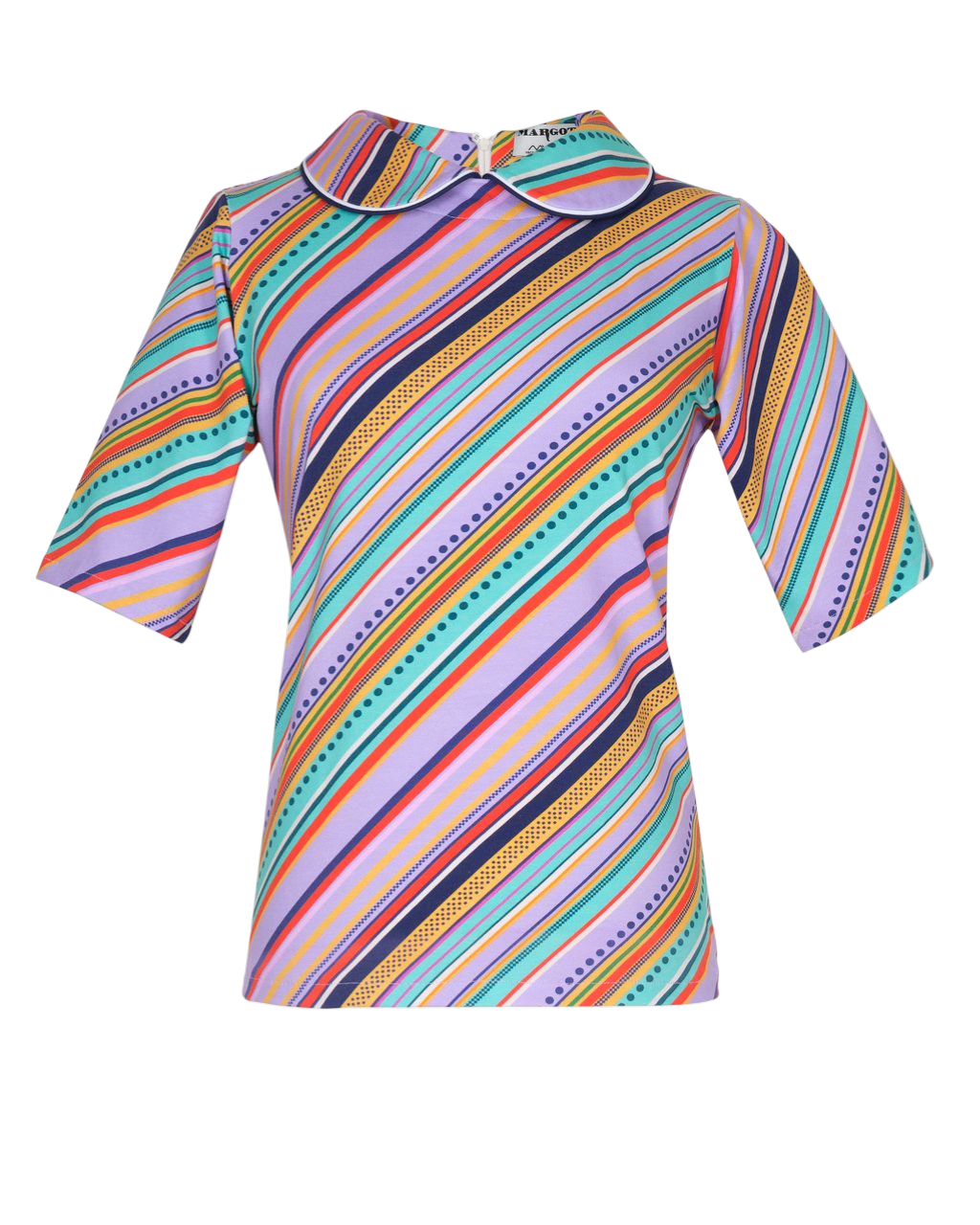 Een speelse en opvallende top met een kleurrijk grafisch diagonaal streeppatroon. De Crossbar top combineert retro vibes met een moderne fit en is een echte eyecatcher in je outfit.