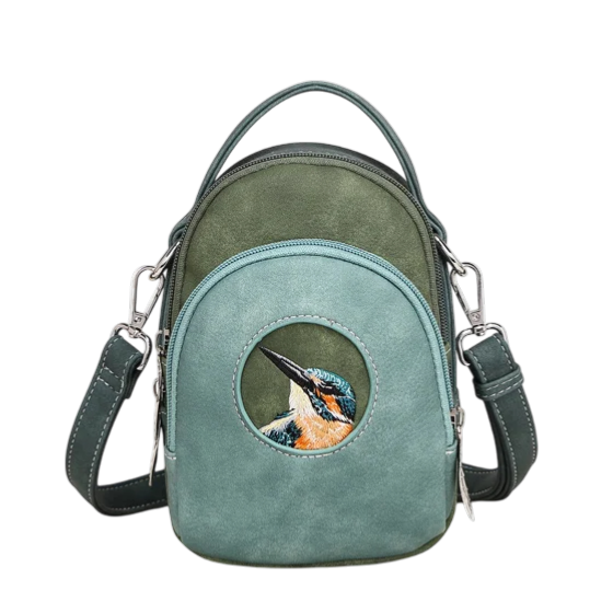 De prachtig geborduurde kingfisher (ijsvogel) op de voorkant geeft deze tas een speelse en unieke uitstraling.