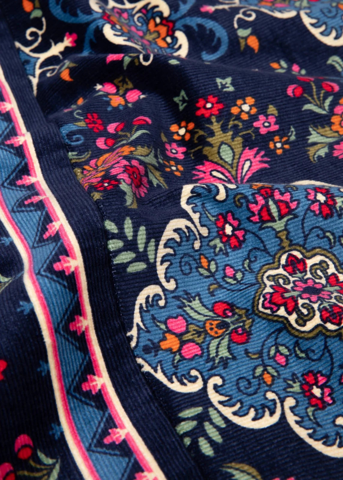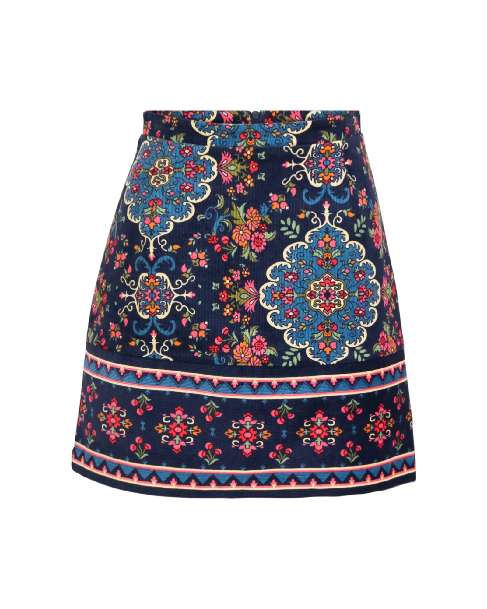 De ribcord stof geeft de rok structuur en een subtiele retro vibe, terwijl de fantasieprint zorgt voor een speelse twist. Dankzij de figuurnaden voor en achter sluit de rok mooi aan. De voering en blinde rits zorgen voor een comfortabele en nette afwerking.