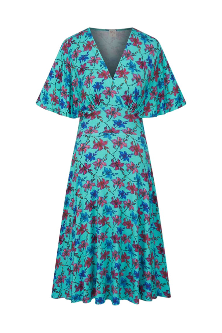 • Kleur: basis turquoise met blauw, donker rozerode fantasie bloemenprint