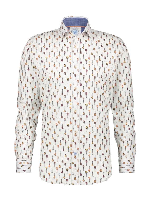 Het Guitars F Classics overhemd is een echte must-have voor muziekliefhebbers. De speelse all-over gitaarprint geeft dit shirt een rock-’n-roll randje, terwijl de comfortabele stretchkwaliteit zorgt voor een fijne pasvorm. Een vaste waarde binnen de NOS-collectie (Never Out Of Stock).