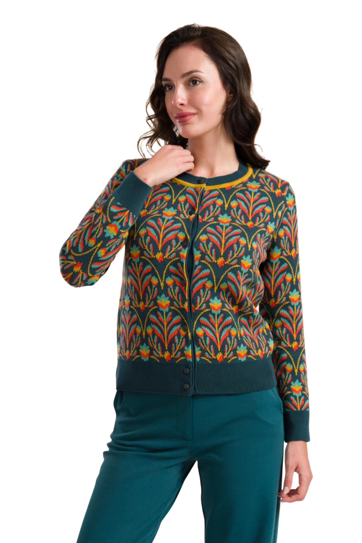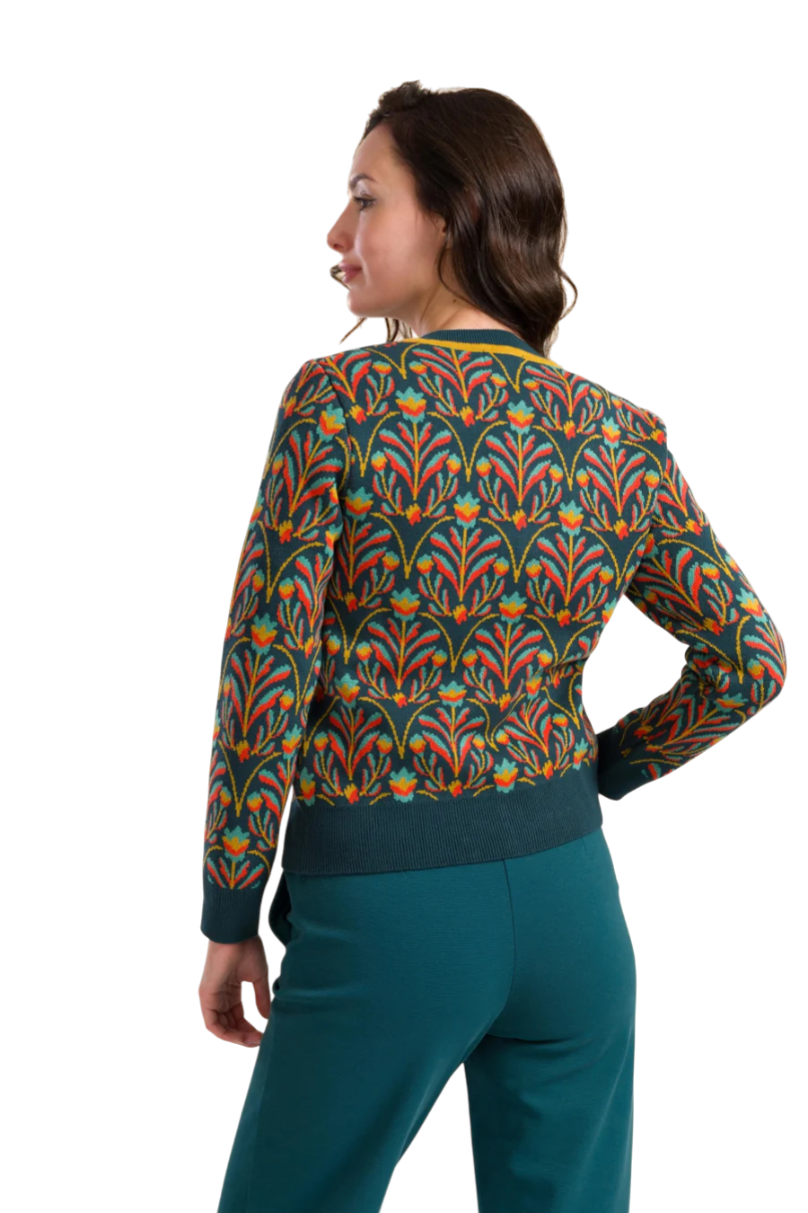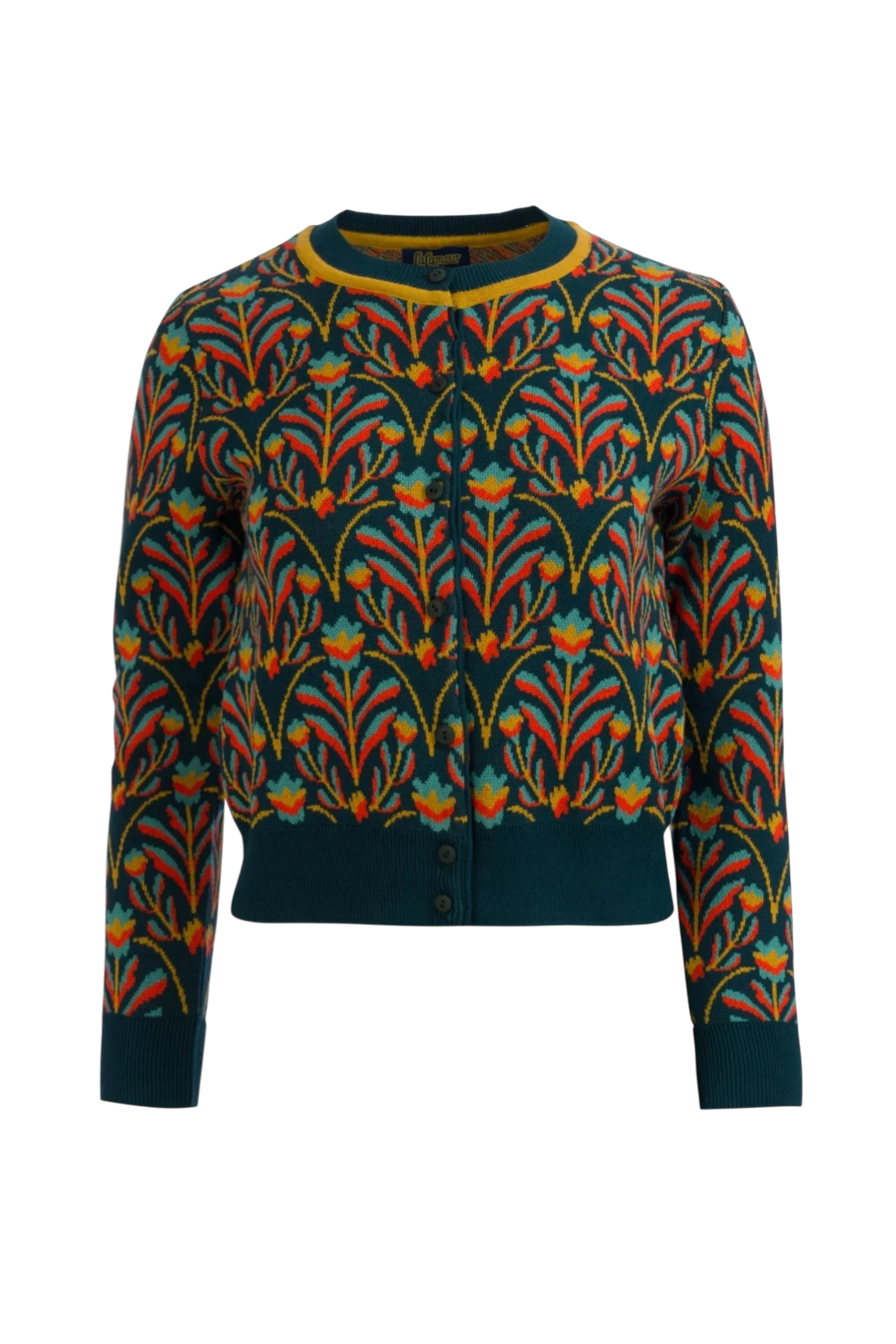 De LaLamour Knitwear Cardigan in Barock Flower is een echte statement piece. Het rijke barokke bloemmotief in warme contrasttinten komt prachtig uit op de diep petrolgroene basis en geeft elke outfit een artistieke, elegante uitstraling.