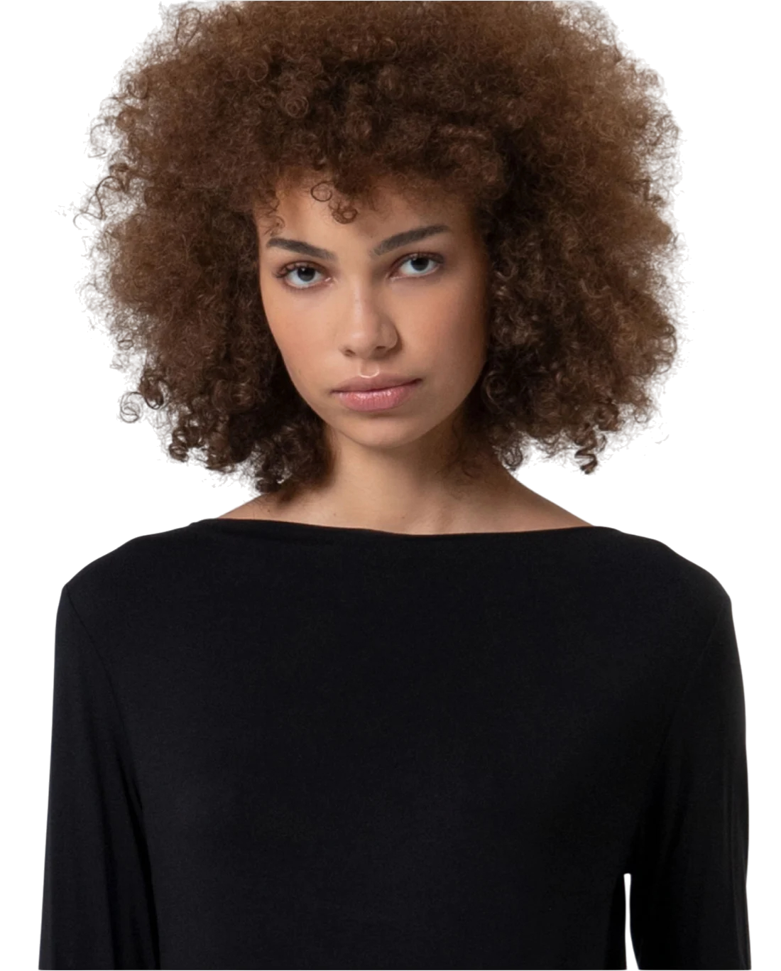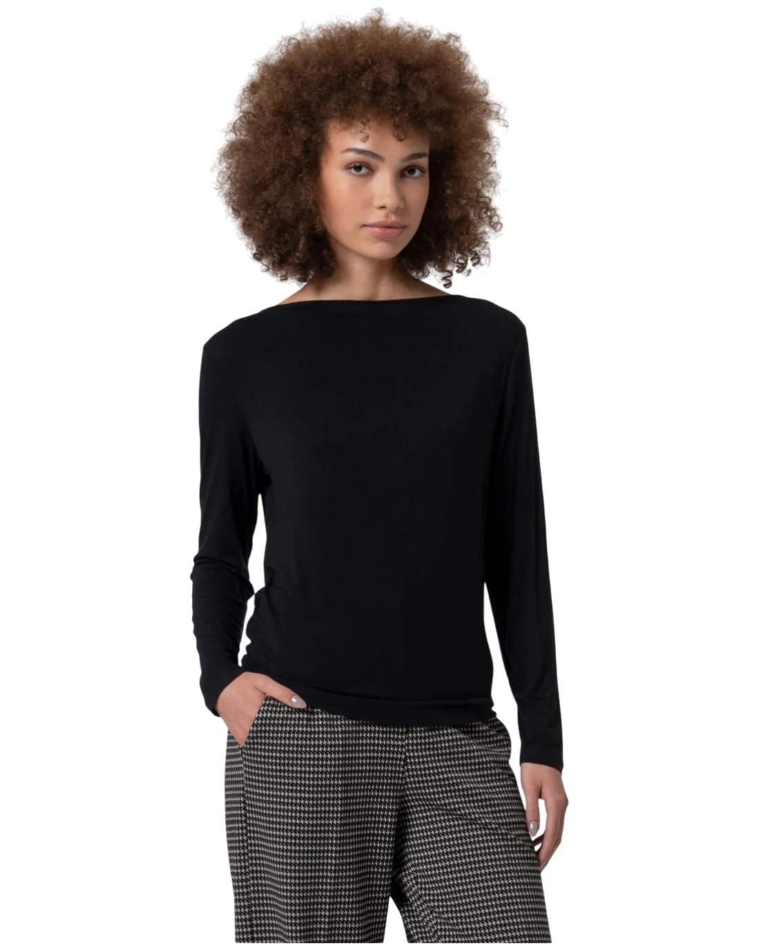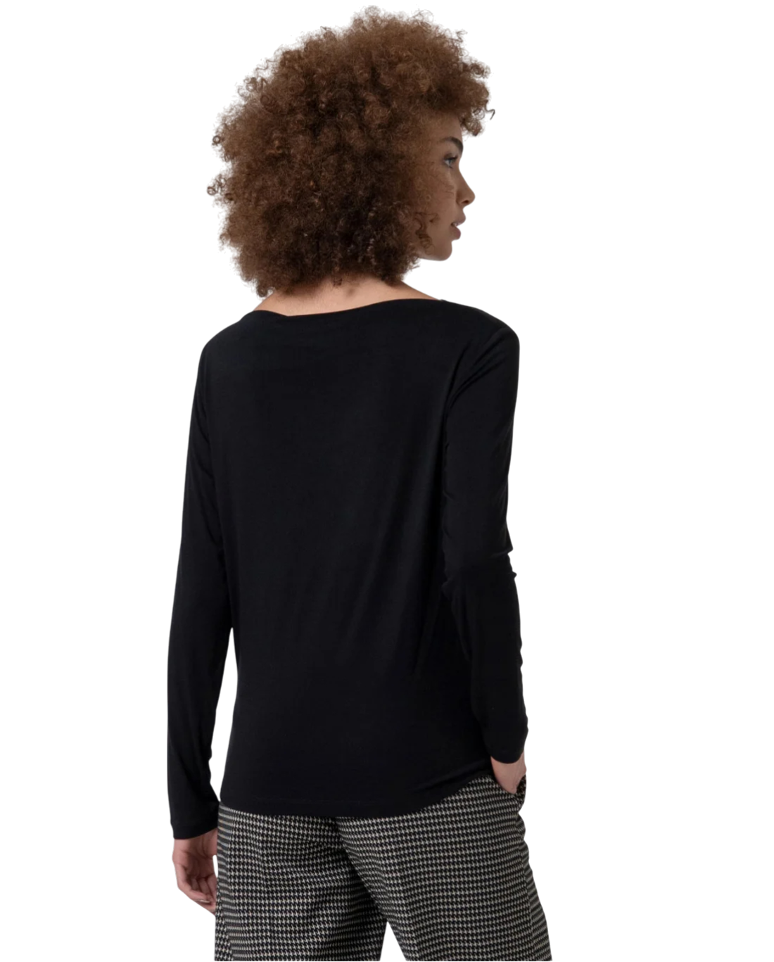 De Surkana Lisi top is een tijdloze basic met een verfijnde uitstraling. Dit zwarte T-shirt heeft een losse pasvorm en een elegante boothals, waardoor hij moeiteloos combineert met zowel casual als gekledere outfits.