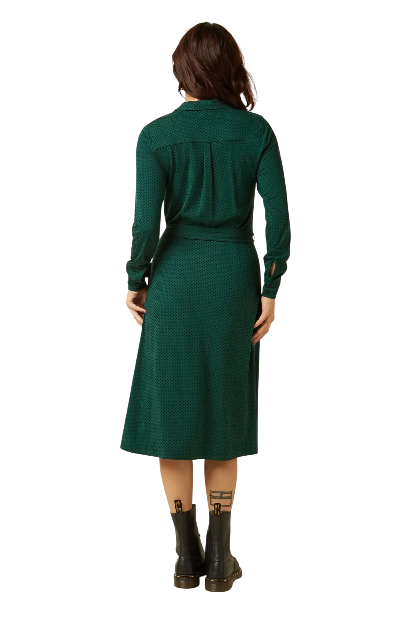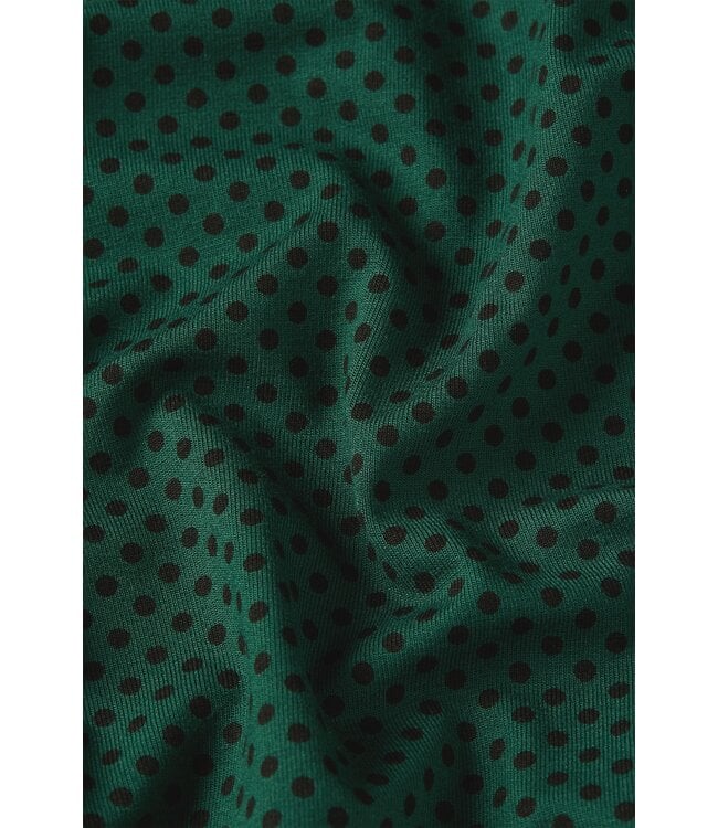 De Lola Dress Piper – Botanical Green is een midi-jurk met een mooi uitlopende pasvorm, gemaakt van comfortabele, rekbare viscosejersey. De klassieke polkadotprint, lange mouwen, reverskraag en knoopsluiting geven deze jurk een verfijnde retro uitstraling.
