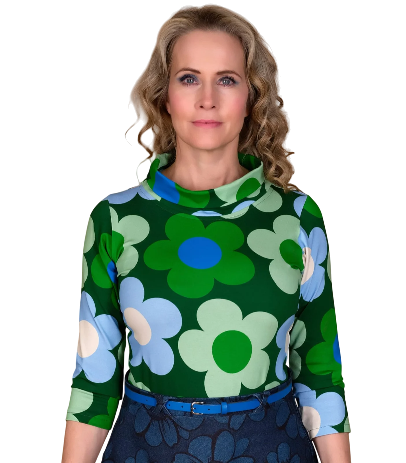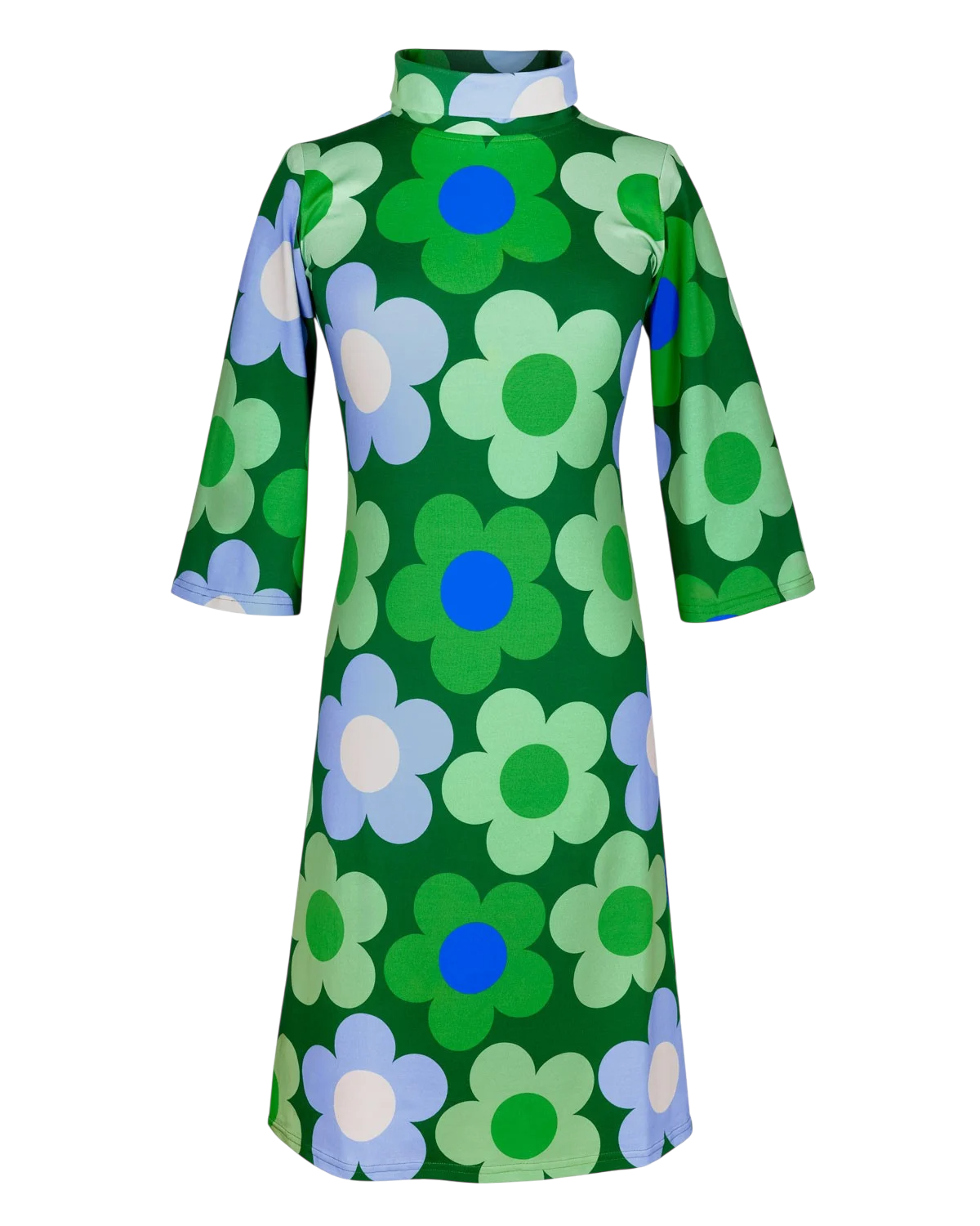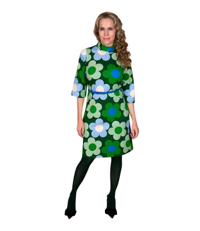 De klassieke bloemenprint in groen- en blauwtinten geeft deze jurk een echte seventies vibe, terwijl de aansluitende pasvorm zorgt voor een vrouwelijk silhouet.