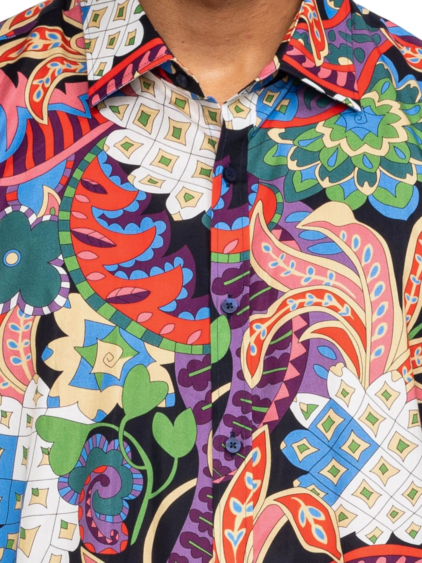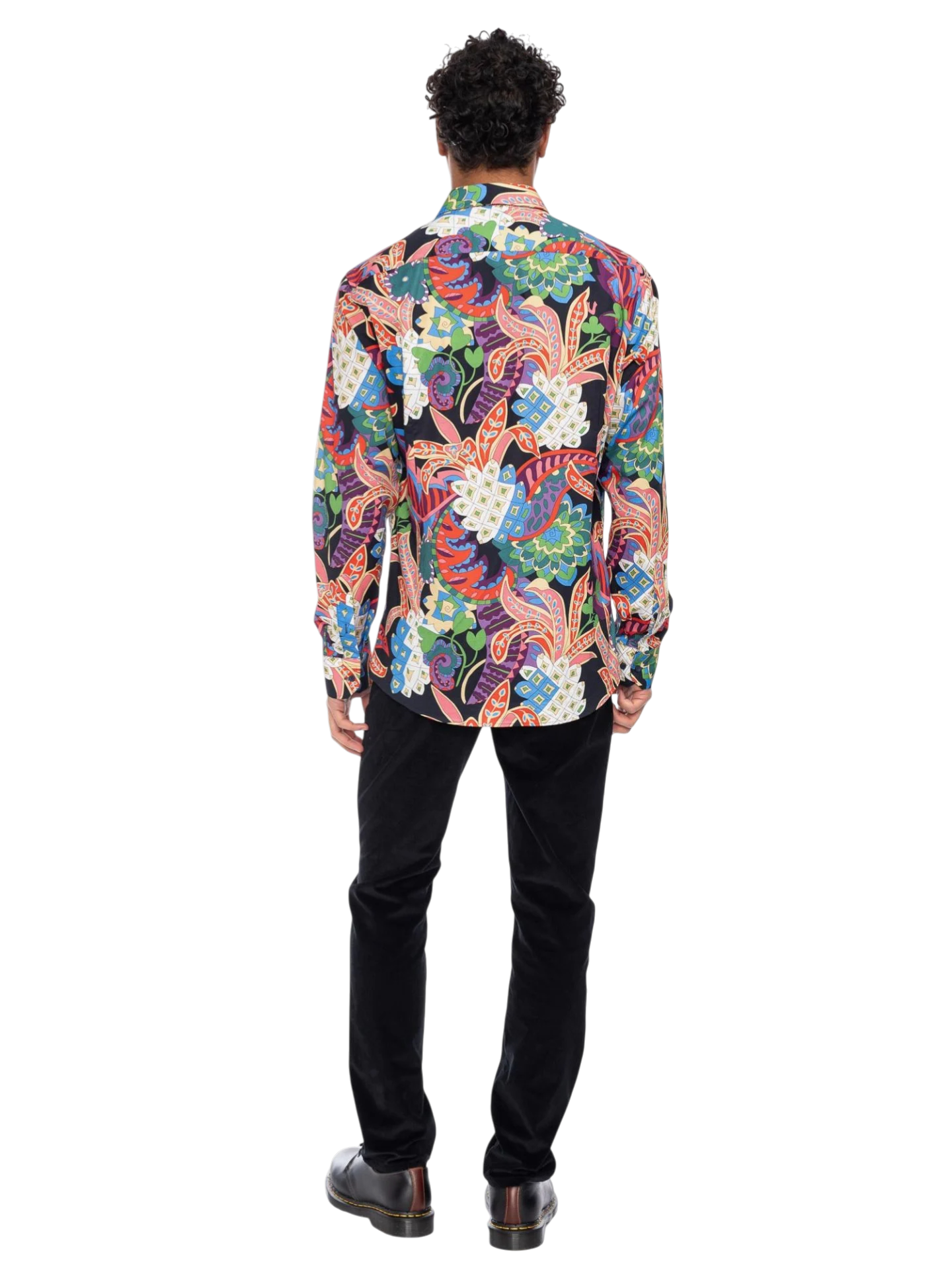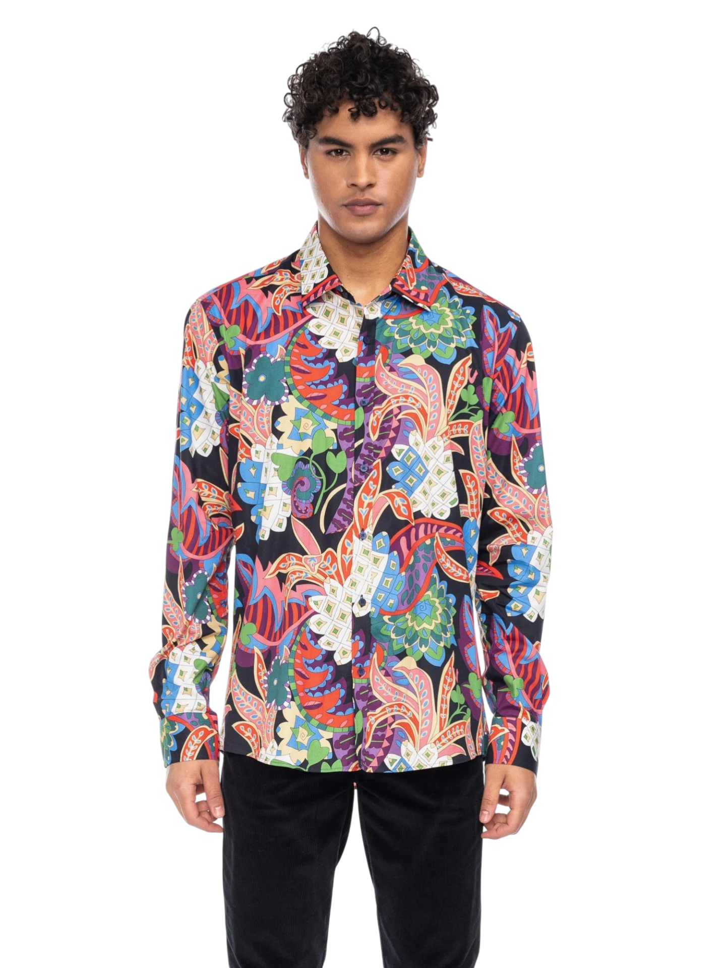 De Ato Berlin blouse “Tamuza” in multi is een waar kunstwerk in overhemdvorm. Het complexe, kleurrijke ontwerp combineert traditionele invloeden met moderne geometrische vormen. Levendige roodtinten, diepe blauwen en verschillende groennuances komen samen op een donkere achtergrond en zorgen voor een uitgesproken, unieke uitstraling.